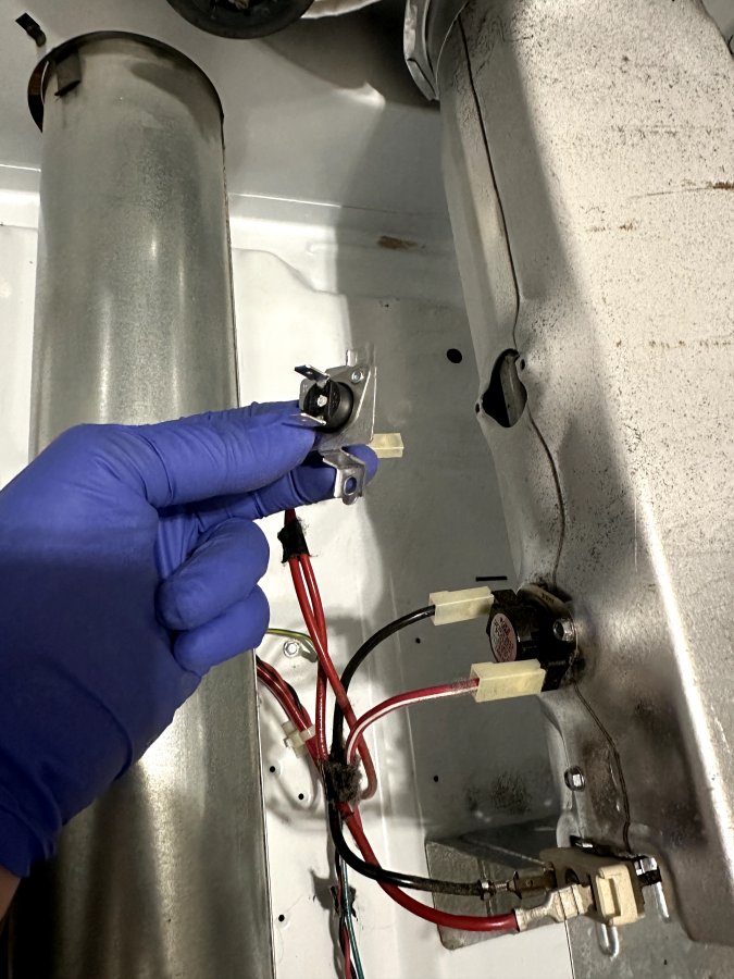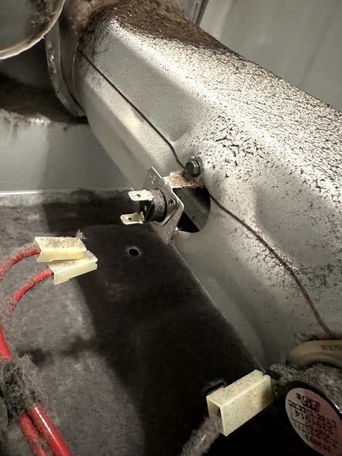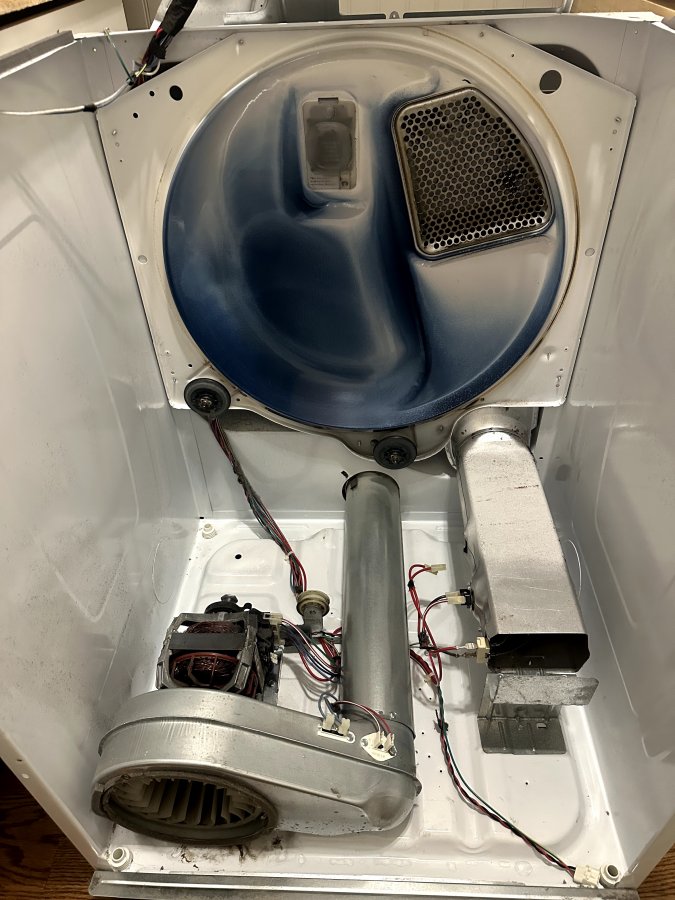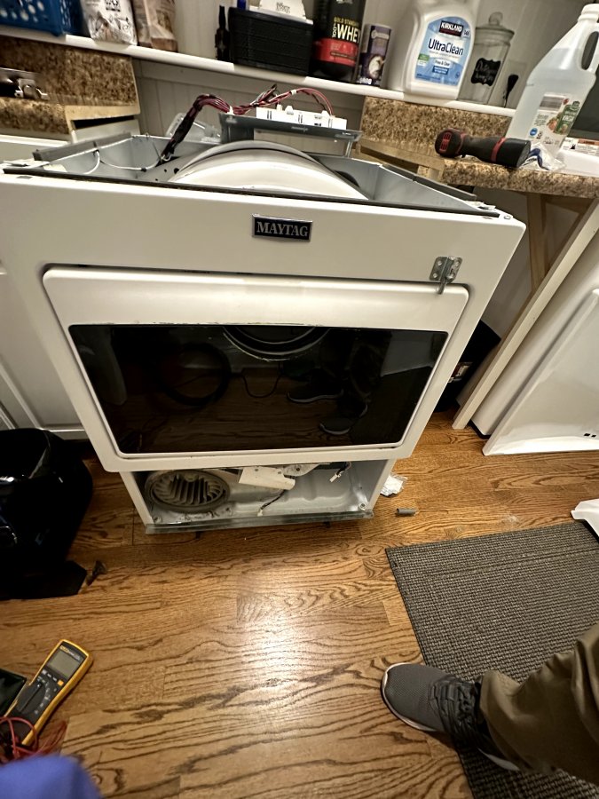 Performed a complete diagnostic on a Maytag dryer with no heat and a door that wouldn’t shut. Found a blown thermal fuse preventing heating, and a worn-out door latch causing the closure issue. Recommended a full lint cleaning for safety and efficiency. Cleaned the internal components, replaced the fuse, cleaned and lubricated the drum support rollers, replaced the door latch, and cleared the entire vent duct. Dryer is now heating efficiently and working like new. Customer was very satisfied with the result.