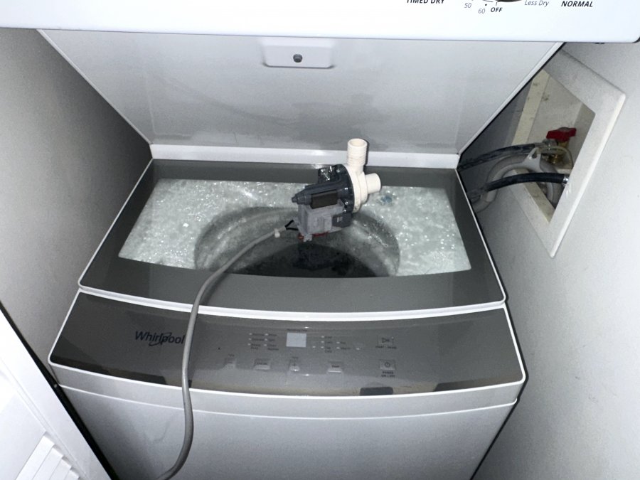 If your stacked washer/dryer unit stops draining, it may be due to a failed pump. This Whirlpool WET4024HW0 repair in Raleigh (ZIP 27617) involved replacing the drain pump to restore full washing function in a compact laundry center.